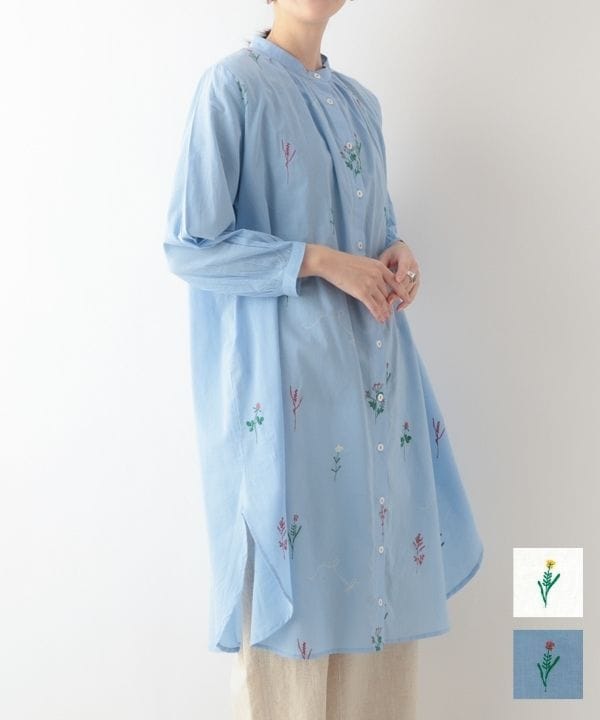お花とトンボ刺繍コットンシャツワンピース 26S038【1月頃入荷予定】
