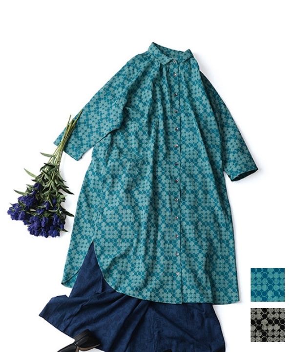 オーガニックコットン・碁石ドットプリントギャザーシャツワンピース 26S406【3月頃入荷予定】