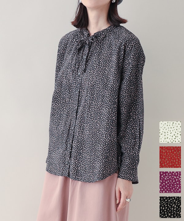 さえずる小鳥さんプリント・カンタ風ドビーボトルネック・ブラウス 25W411